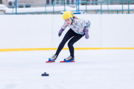 Slim teenage girl skating on the ice track on short treck training