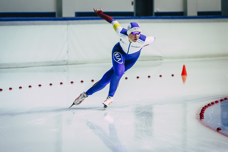 Chelyabinsk; Russia - December 3; 2015: woman athlete speedskater goes around turn sprint distance during Cup of Russia on speed skating