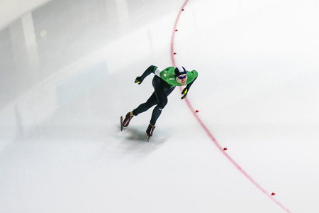 Chelyabinsk, Russia - October 15, 2015: man athlete skater on track is turn during Cup of Russia on skating sports