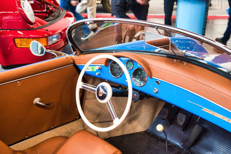 FRIEDRICHSHAFEN - MAY 2019: orange interior of blue PORSCHE 356 1948 cabrio at Motorworld Classics Bodensee on May 11, 2019 in Friedrichshafen, Germany.