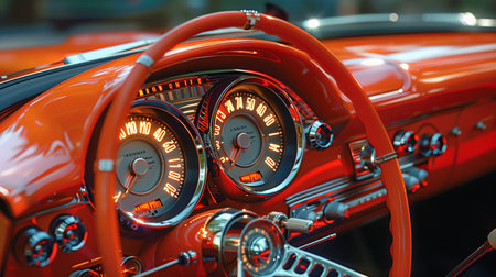 The handcrafted dashboard of a classic car featuring a of analog dials and glowing indicators reminiscent of a bygone era