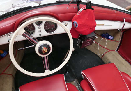 Bray, Ireland, June 2018 Bray Vintage Car Club show, open air retro cars display. Close up on clocks and dashboard of red MG TF Roadster from 1950s
