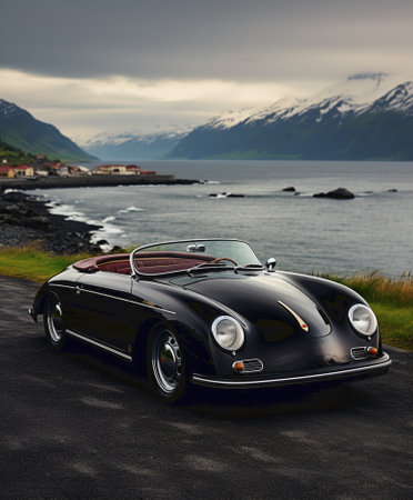 A stunning classic dark green roadster speeds along a picturesque winding road. This vintage convertible showcases freedom, style, and motion against a backdrop of beautiful rolling hills.