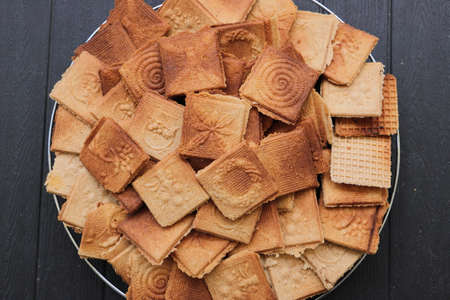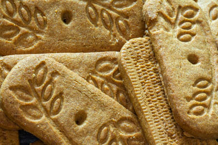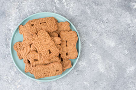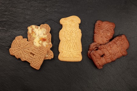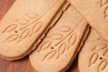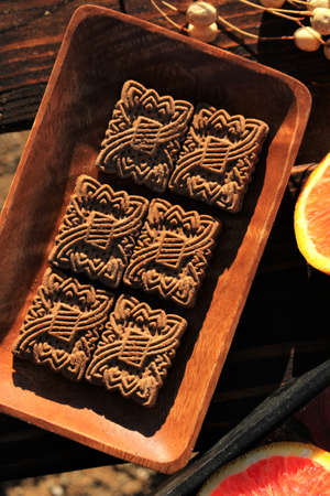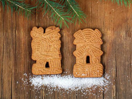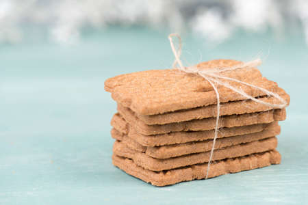Traditional cookies from northern europe called Speculoos on wooden table. Festive cookies made with spices