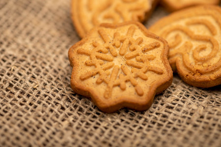 Delicious homemade cookies on a wooden table on a homespun fabric with a rough texture. Close-up selective focus