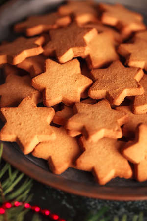 Yummy Ginger cookies, traditional Christmas treat. Gingerbread background.