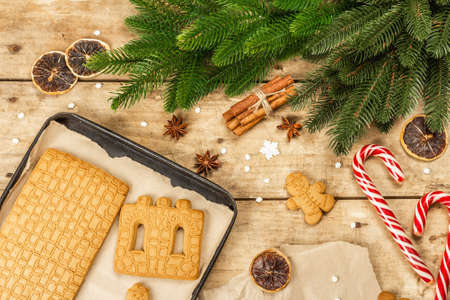 Christmas Gingerbread House and Gingerbread Men. Traditional festive New Year design, cooking process. Old wooden background, rustic style, top view