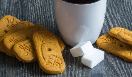 Speculaas koekjes and espresso for st. Nicolas . Dutch holiday Sinterklaas traditional sweets gingerbread cookies. 5th December holiday in the Netherlands.