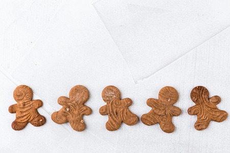 Close up of Christmas pastries, gingerbread cookies, ready to eat traditional Xmas and New Year pastry on white paper.