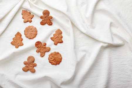 Christmas gingerbread cookies on a textile background. Preparing for the winter holidays. Top view, flat lay