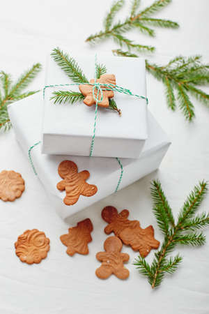 Christmas gifts wrapped in white paper and decorated with spruce sprigs and gingerbread cookies on a fabric background