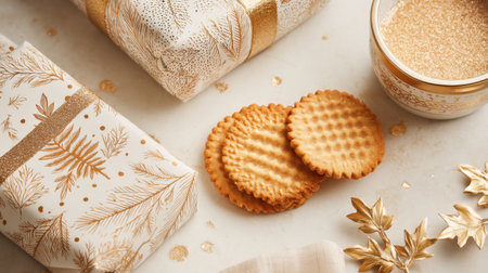 A beautiful flat lay featuring elegant gifts wrapped in decorative paper, delicious golden cookies, and a stylish sugar bowl, creating a festive atmosphere perfect for holidays.