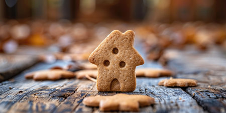 A charming gingerbread house is prominently displayed on a rustic wooden table, surrounded by scattered cookie stars. The house features a warm, golden-brown color and details like windows and a door, adding to its inviting appearance. The backdrop is filled with hints of autumn, as leaves and other seasonal elements create a cozy atmosphere.