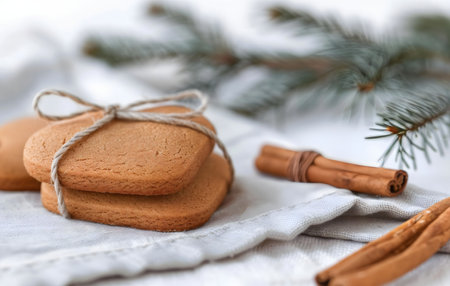 Close-up of delicious gingerbread cookies tied with twine, accompanied by cinnamon sticks and pine branches. A festive holiday treat.