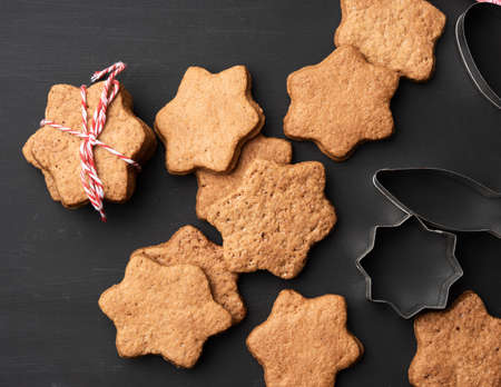 baked star shaped gingerbread cookies, wooden rolling pin and metal cutters on a black table, top view