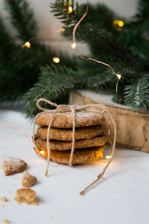 Homemade biscuits on the white table, Christmas tree and new year's garland
