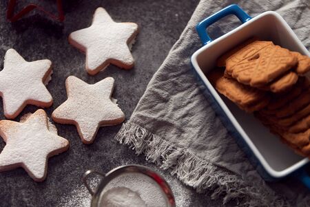 Cookies in the form of stars for Christmas and new year's table on a dark background in vintage