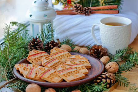 Christmas eve. Cookies in shape of houses and white cup of tea