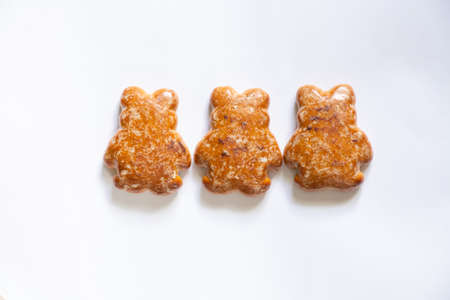 homemade gingerbread cookies in the shape of a bear on a white background close-up, dissert
