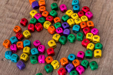 Beads letters Small coloring alphabet cube over bright yellow background. Education Copy Space Concept