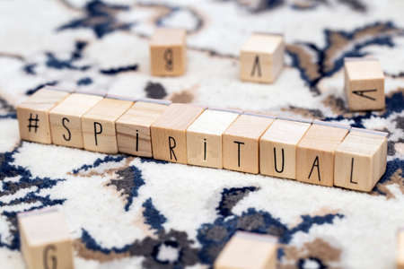 Wooden cubes with a hashtag and the word Spiritual, social media and spiritual concept background