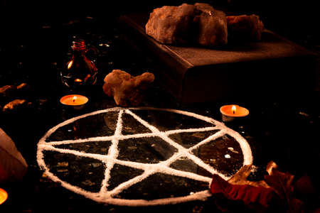 Mystic ritual and candles. Devil's board concept, black magic or fortune telling rite with occult and esoteric symbols. Mystical rituals and occult sciences.