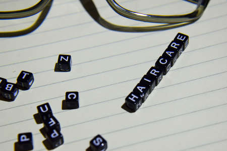 Concept of Hair Care on wooden cubes with glass eye, books in Vintage background