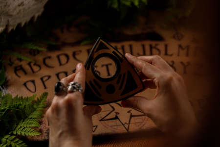 Mystic ritual with Ouija and candles. Devil's board concept, black magic or fortune telling rite with occult and esoteric symbols. Mystical rituals and occult sciences.
