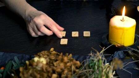 Astrology and esotericism. The witch is reading from Runestones, and there is a candle nearby. Sparks of fire in the air. Dark background. Palms close up.