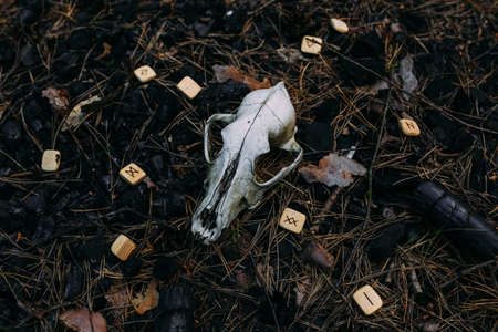 Burning candle and old scull in enchanted forest. Occult, esoteric concept.