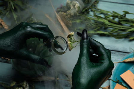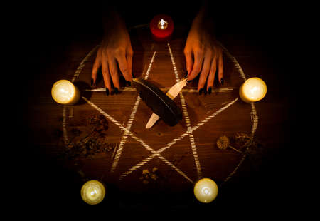 Female hands on the altar in the dark. Witch does magic using pentagram, candles, feathers, dry herbs on wooden surface, selected focus, low key.