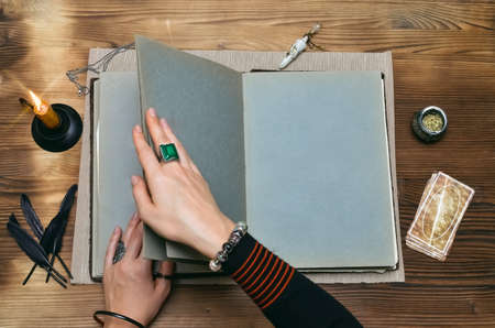 Book of magic. Tarot cards on fortune teller desk table. Future reading. Woman witch reads a ancient magic scroll book with copy space and blank pages and learn art of prediction on wooden table.