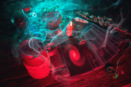 Blurred still life with vintage esoteric magic objects and old tarot cards on witch table altar for mystic rituals and fortune telling. Halloween and gothic concept.