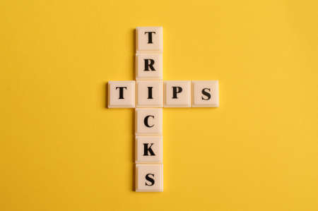 Square letters with text TIPS and TRICKS isolated on yellow background