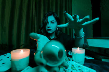 Beautiful young long hair woman fortune teller using tarot card to predict the future in dark room.