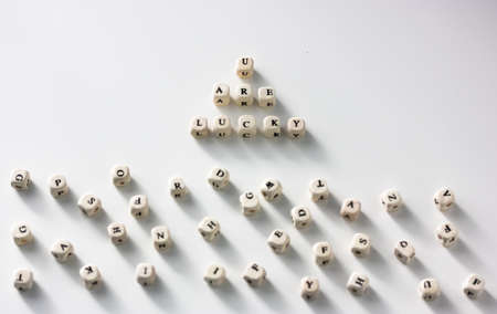 You are lucky words written on wood blocks, white table background, black and white letters on wooden blocks. Business success and motivation for action