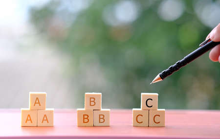 Blurred Text dice cube background. abstract blur. Text dice cube concept / Letter dices alphabet on wooden background. Block of alphabet studded on the floor. vintage style.