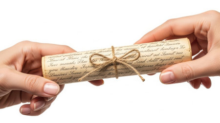 The image depicts a pair of hands gently holding a rolled-up scroll tied with a string. The scroll appears to be made of aged parchment with handwritten text visible on its surface. The hands are positioned in a way that showcases the scroll prominently against a plain background.