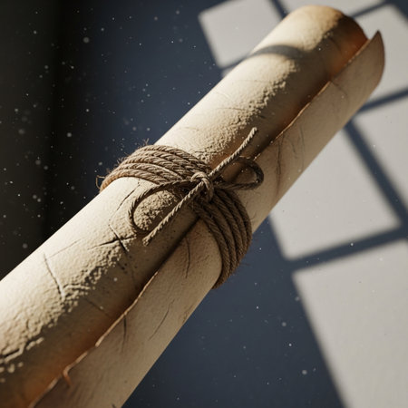 Partially unfurled, aged parchment scroll tied with coarse twine under dramatic harsh sunlight.