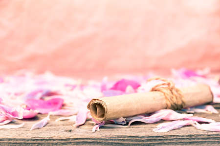 Roll of old paper on rose petals. Love letter, a wedding invitation. Romantic atmosphere of holiday.