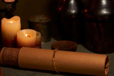 Ghost story parchment. Mystery and interesting papers burnings candles. Generate AI