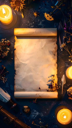 A blank parchment scroll lies illuminated by warm candlelight, decorated with dried flowers, a white feather, and antique writing objects on a dark surface