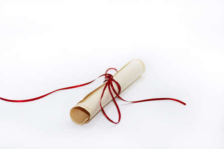 A parchment diploma scroll, rolled up with red ribbon laid at an oblique angle. Processed to give a vintage or retro appearance.