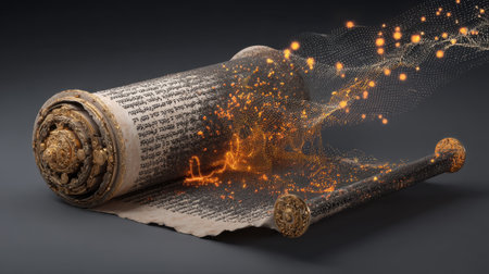 An artistic portrayal of an ancient scroll unrolling, featuring glowing data visualization elements and a mystical aura, ideal for concepts of knowledge and technology.