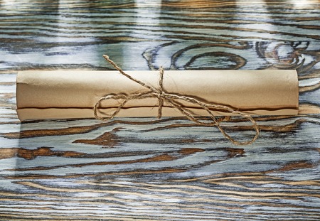 Close-up old scroll on wooden desk. Rolled paper on grey wooden table.