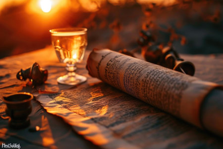 A serene moment is captured as an open Megillah scroll is paired with a wine glass and Purim noisemakers, while the setting sun bestows a warm, sacred radiance upon the scene