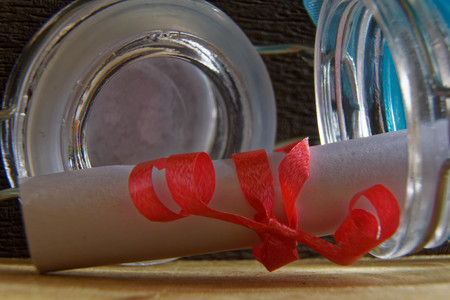 Elegant wedding vow tied with a satin ribbon, placed on a vintage paper, creating a romantic and nostalgic atmosphere