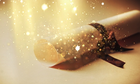 A close-up image of hands holding a rolled certificate tied with twine, glowing softly in a dark background, symbolizing achievement and celebration in a warm and artistic way.