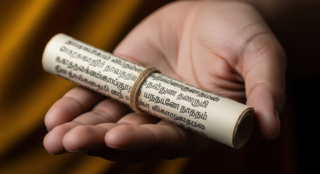A person holds two intricately decorated scrolls tied with red ribbons, evoking a sense of ancient knowledge and tradition.