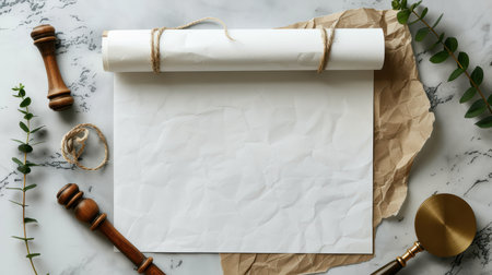 A blank white paper rests on a marble surface, surrounded by natural elements and crafting tools. Perfect for creative projects, invitations, and personalized notes.